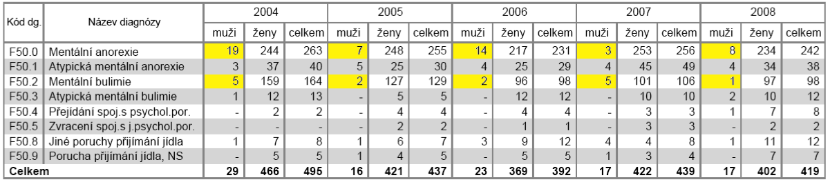 Mentální anorexie a mentální bulimie jsou přezdívány nemoci modelek. Počet osob s touto diagnózou roste, avšak už dávno se netýká pouze žen, ale i mužů. Jaké jsou mezi pohlavími rozdíly v symptomech, kvalitě života a v šanci na vyléčení? Mezinárodní klasifikace nemocí uvádí poruchy příjmu potravy (zkráceně PPP) pod označením F50.0-F50.9, přičemž sem řadí kromě mentální anorexie a mentální bulimie, známých široké veřejnosti, například i záchvatovité přejídání. Prevalence mentální anorexie, bulimie a záchvatovitého přejídání podle DSM-IV se odhaduje na 0,9 %, 1,5 % a 3,5 % u žen a 0,3 % 0,5 % a 2,0 % u mužů (Hudson, Hiripi, Pope, Kessler, 2007). Výskyt jednotlivých onemocnění v České republice v letech 2004-2008 je zobrazen v následující tabulce: