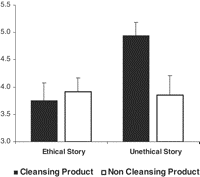 Studie 2 zkoumala, zda se implicitním ohrožením morální čistoty vytváří psychologická touha po čištění, a to prostřednictvím vyjádřených preferencí pro čisticí produkty. Účastníkům bylo řečeno, že se vyšetřuje vztah mezi rukopisem a osobností, a byli požádáni, aby ručně přepsali krátký příběh napsaný v první osobě. Příběh popisovat pomoc spolupracovníkovi či jeho sabotování. Respondenti pak hodnotili potřebnost různých výrobků, např. mýdlo, zubní pasta, dezinfekce, pášek na praní, ale i produkty, které s mytím nesouvisí (zápisník, šťáva, baterie, tyčinka). Opisování neetického příběhu zvýšilo potřebu čisticích prostředků. Nečistící produkty hodnotily obě skupiny stejně (Graf 1).