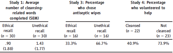 Tabulka 1. Shrnutí výsledků. Studie 1 měřila účinek vybavování etického oproti neetickému chování na duševní přístupnost slov souvisejících s čištěním. Studie 3 zkoumala vliv vybavení neetického chování na výběr antiseptických ubrousků. Studie 4 hodnotila účinek čištění rukou na zapojení do morálního kompenzačního chování.