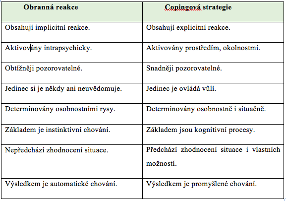 V této teoretické části se budeme jen krátce věnovat obranným mechanismům, více potom rozpracujeme copingové strategie dle jednotlivých teorií. Někteří autoři tyto dvě skupiny zvládacích mechanismů nerozlišují, my je však oddělíme tak, jak to uvádí Paulík (2010) a Vašina (2002). Hlavní rozdíl vidíme v tom, že obranné mechanismy se nesnaží zátěžovou situaci měnit, spíše nevědomě chrání integritu osobnosti. Další odlišnosti jsou přehledně zpracovány v Tab. 1.