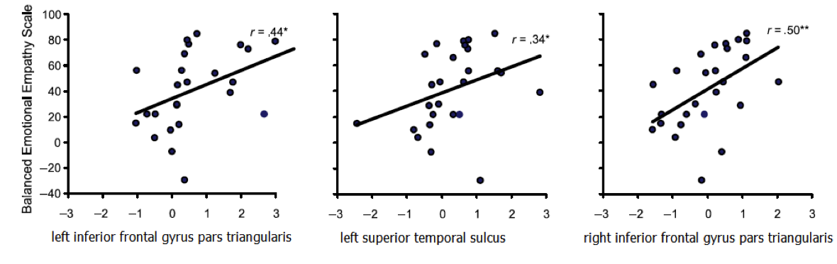 Analýza výsledkov ukazuje, že výsledky v teste a miera aktivácie jednotlivých centier spolu štatisticky významne korelujú. Podrobnosti vidíme na obrázku č.1 (prevzaté z Schulte- Rüther et al., 2007, upravené), kde *p<0,05 a **p <0,001. Aktivácia týchto centier sa viaže tak k “other-task” ako “self-task” (definované vyššie), z čoho autori vyvodzujú, že systém zrkadlových neurónov sa podieľa na prisudzovaní emócií druhým ľuďom aj na dekódovaní svojich vlastných pocitov. Tie sa zároveň zhodujú s emóciou prezentovanou na obrazovke.