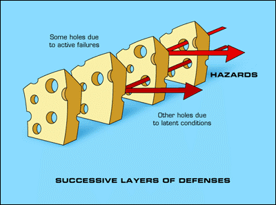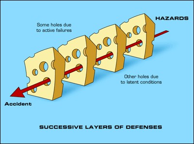 Problém nastáva, pokiaľ sú vrstvy umiestnené s dierami v jednej rovine. Takýto systém umožňuje problému prejsť všetkými vrstvami od začiatku až ku koncu, ktorý môže mať katastrofické následky. Práve tieto diery predstavujú nečakané udalosti v konkrétnej situácii (náhody), ktoré navrstvené na sebe spôsobia zlyhanie. Nestáva sa to často. Ale keď sa to stane, je to výsledok zhody okolností. Pokiaľ v jeden deň dôjde k viacerým malým zmenám – tašku s detskými plienkami ste uložili na zadné sedadlo namiesto sedadla spolujazdca, popri ceste do škôlky ešte zaveziete ďalšie dieťa do školy, čo naruší vašu dennú rutinu atď., pri ich nakumulovaní môže k dôjsť k zlyhaniu s fatálnymi následkami. Ako povedala Janette Fenellová, zakladateľka a riaditeľka spoločnosti Kids and Cars, „ľudia potrebujú pochopiť, že nejde o zlyhanie (rodičovskej) lásky. Ide o zlyhanie pamäte“ (Fenell in PressReader, 2015). Zdroje