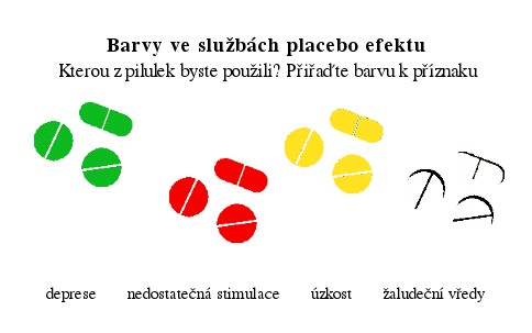 Steve Silberman (2009) pátral, zda má barva placeba vliv na konkrétní obtíže. Prošel několik studií a zjistil, že na některé potíže působí lépe pilulky určitých barev. Rešerši zveřejnil v magazínu Wired. Podle Silbermana je žlutá barva nejlepší pro antidepresiva, protože symbolizuje sluneční svit. Červené pilulky působí agresivně, ale mohou pacienta nakopnout ke změně a stimulovat. Zelená barva snižuje úzkost. Bílé tablety zase uklidňují žaludeční vředy. Také placebo nesoucí označení známé firmy a ochranné známky je účinnější než obyčejně zabalené prášky. Zlý bratr noceboStejně jako pozitivní stimulace a přístup může vést k výraznému zlepšení stavu klienta, mohou naopak některé chyby stav pacienta poškodit. Nevysvětlitelné zhoršení po začátku léčby (bez zřejmých vnějších příčin) bývá přičítáno nocebo efektu. Zdravotníky a psychology staví před etické dilema: Do jaké míry sdělit klientům rizika léčby, pokud samotný popis vedlejších účinků může zvýšit pravděpodobnost jejich výskytu? Nad touto problematikou se v srpnu 2012 zamýšleli redaktoři The New York Times. Jak očekávání pacientů užívajících antidepresiva souvisí s placebo a nocebo efektem, zkoumali Rutherford, Wall, Glass a Stewart (2014). Současné studie: Pomůže nám placebo, i když víme, že to není možné?Některé nové výzkumy (Kaptchuk, 2011) naznačují, že placebo efekt může fungovat, přestože pacienti vědí, že pilulky neobsahují účinnou látku. Kaptchuk vybral 80 pacientů trpících syndromem dráždivého tračníku. Kontrolní skupině nepředepsal žádnou léčbu, druhá část užívala dvakrát denně léky, o nichž věděli, že jsou z cukru. Výraz „placebo“ umístil i na obal. Během 3 týdnů ohlásilo 59 % pacientů užívajících cukrové pilulky úlevu od bolesti, z kontrolní skupiny stejného stavu dosáhlo 35 %. Je ovšem možné, že ve výzkumu působila intervenující proměnná (nežádoucí jev, který zasahuje do výzkumu a zkresluje výsledky, v tomto případě například snaha účastníků experimentu pomoci výzkumníkům dosáhnout očekávaných výsledků), jež pacienty ovlivnila. Kaptchuk zároveň neměřil objektivní míru úlevy, ústup bolesti hlásili sami pacienti. Možná zde zafungoval výše zmíněný mechanismus reflexu. Braní léků, které lze označit za moderní rituál, nastartovalo produkci endorfinů. Ty přinesly zlepšení. Pokud by se tato domněnka potvrdila, znamenalo by to, že placebo efekt může fungovat i bez předpokladu nutné nevědomosti pacienta. Další studie, která prokázala 80% shodný účinek antidepresiv a placeba, naznačuje, že léky v terapii patrně nejsou nejdůležitějším faktorem pozitivních změn (Kirsch, 2003). Příznivci placeba vychází z přesvědčení, že člověk má natolik silnou psychiku, aby ovlivnil své zdraví. Význam placebo efektu spočívá ve schopnosti zvyšovat účinnost medikace psychologickými prostředky, nebo snižovat potřebné množství léků. Na placebo je nutné pohlížet jako na podpůrnou a dočasnou léčbu, která dosahuje dobrých výsledků především v terapii. Pokud vyloučíme možnost poškození pacienta nocebo efektem, zdá se tato metoda zajímavou možností při řešení nejasných případů. British Medical Journal v roce 2008 odhadl, že až 50 % amerických lékařů předepisuje právě takovéto léky (ovšem bez vědomí pacientů) často proto, že neví, jak dále pokračovat. Zdroje